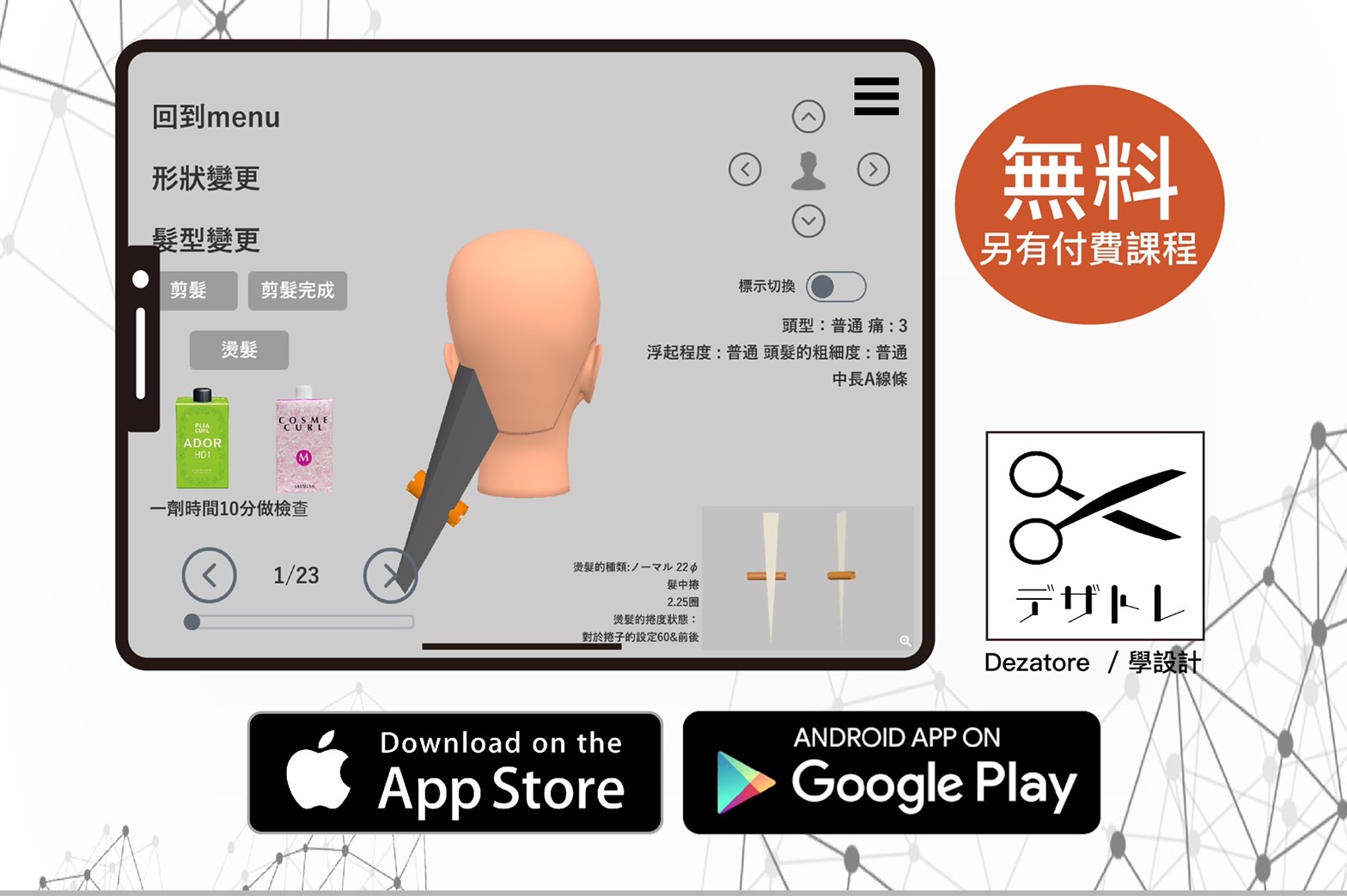透過此APP的使用,讓美髮設計師可以輕鬆的學習到美髮技術! 剪髮、燙髮、瀏海內輪廓、設計染髮等,在3DCG驅動下,所有的內容跟角度都可以一目了然淺顯易懂。